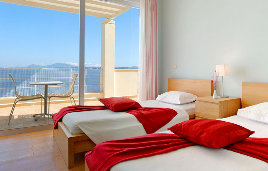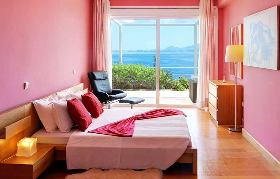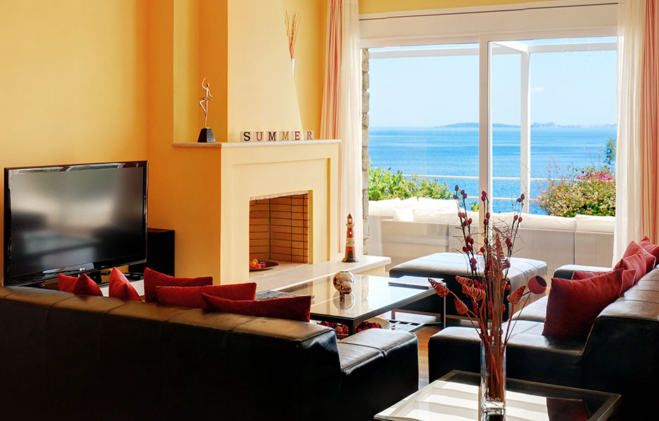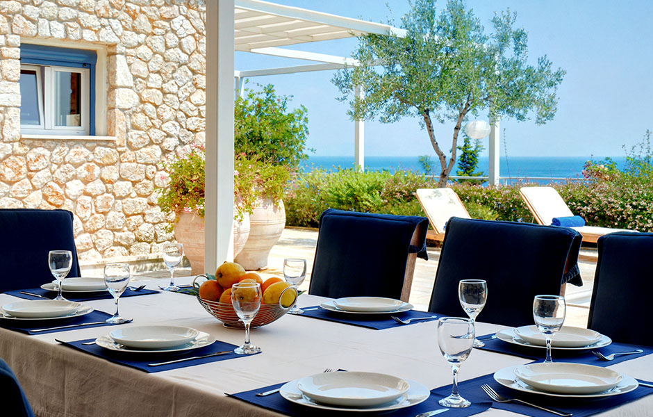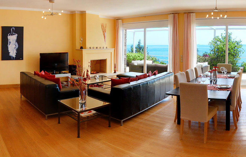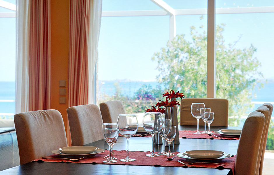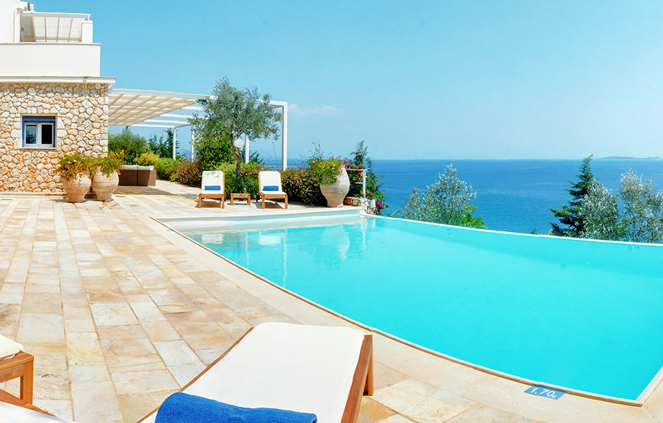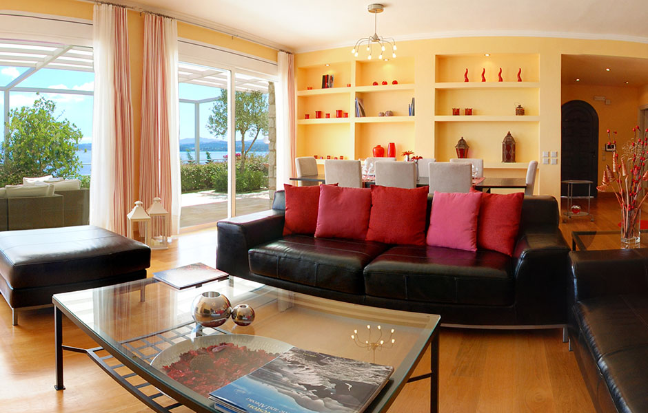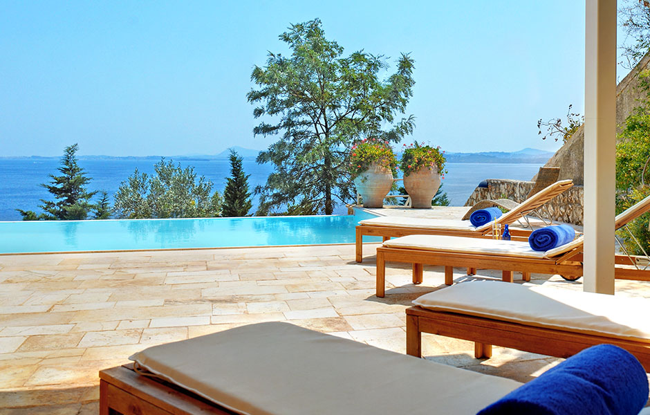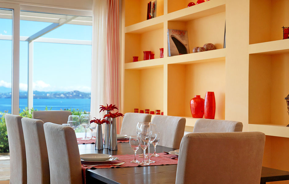 Built on a slope the villa offers breathtaking views of the crystal-clear blue waters with nothing blocking the sight as far as the town of Corfu it also offers access to a virtually private beach otherwise accessible only by sea.